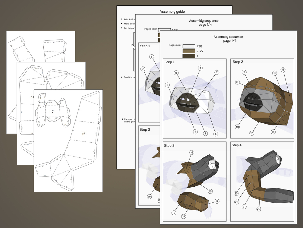 You will need colored paper (160-250 grams per square meters), printer, glue,ruler, scissors, a little time and inspiration.Assembly sequence are indicated in the assembly guide.